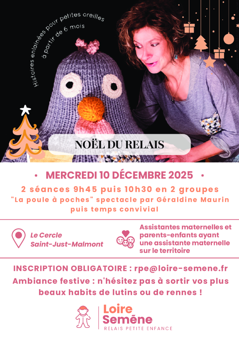 Le 10 Décembre 2025 Noël du RPE au Cercle Saint Just Malmont avec Géraldine Maurin « Poule à poches » contes et marionnettes.