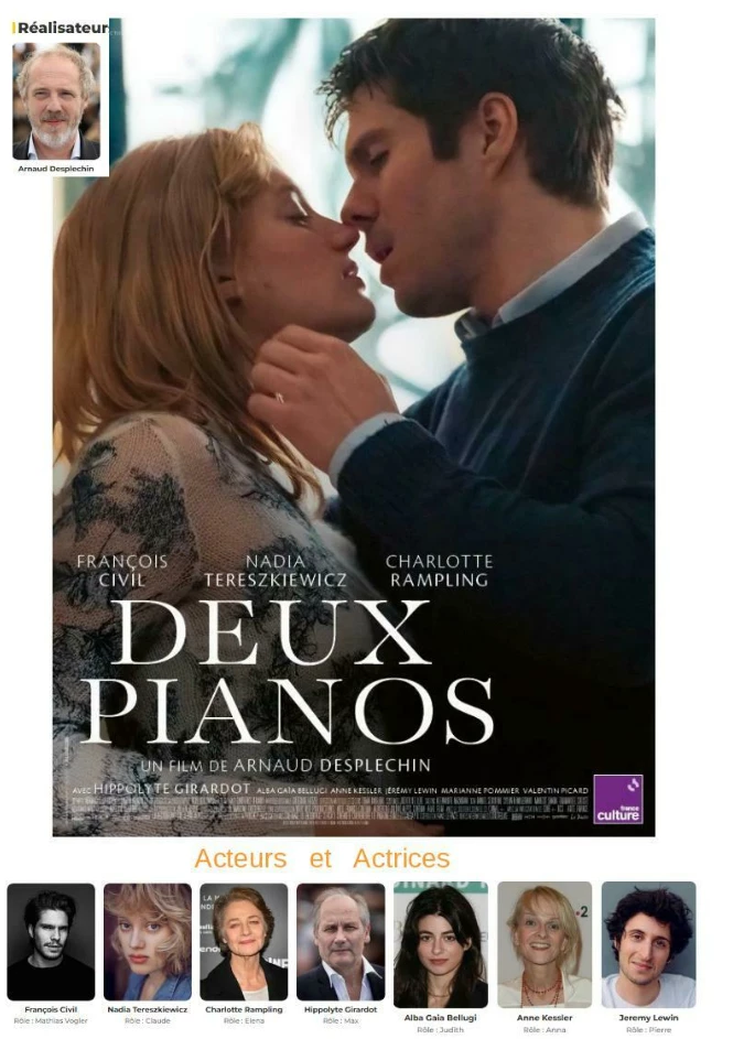 Séance de cinéma "Deux pianos" de Arnaud Desplechin. 1h55 min. Avec François Civil, Nadia Tereszkiewski, Charlotte Rampling. Drame.
