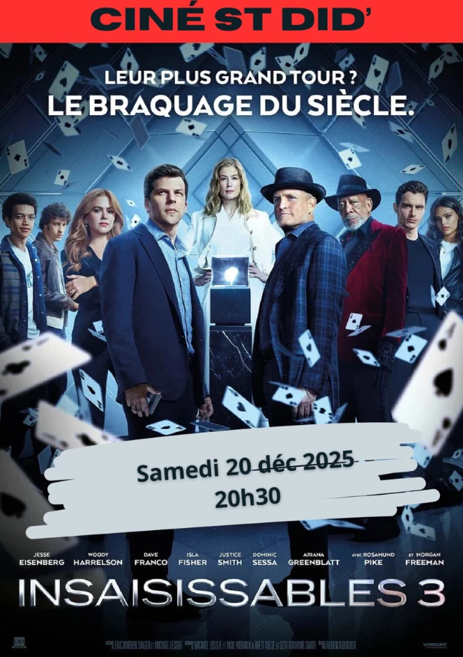 Séance de cinéma "Insaisissables 3" de Ruben Fleischer. Durée : 1h53. Avec Jesse Eisenberg, Woody Harrelson, Dave Franco.