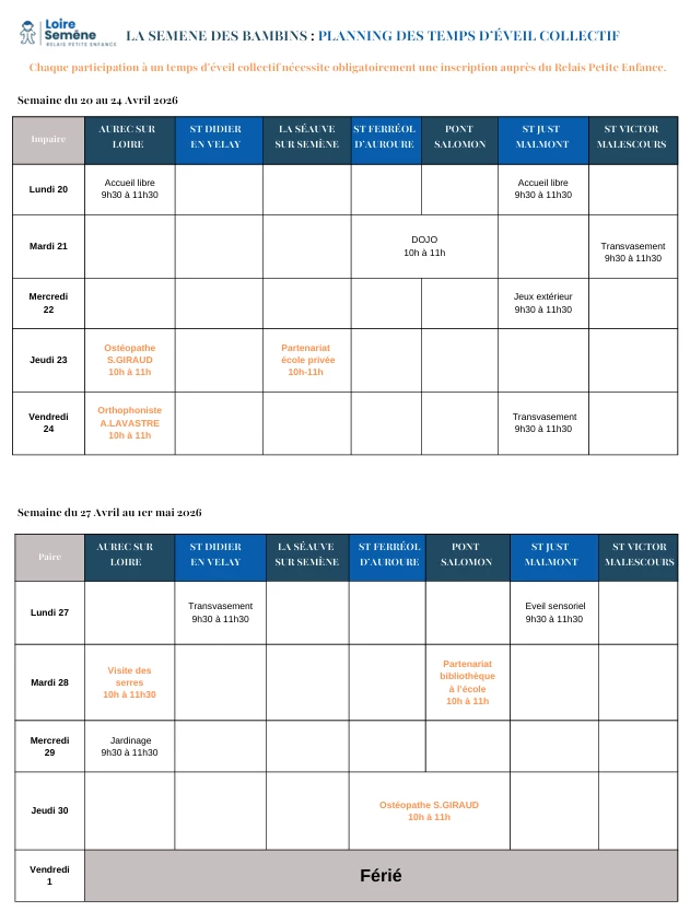 Le relais La Semène des bambins, géré par la Communauté de Communes Loire Semène, propose ses services auprès des enfants, futurs parents, parents et professionnels de la petite enfance. Il permet :